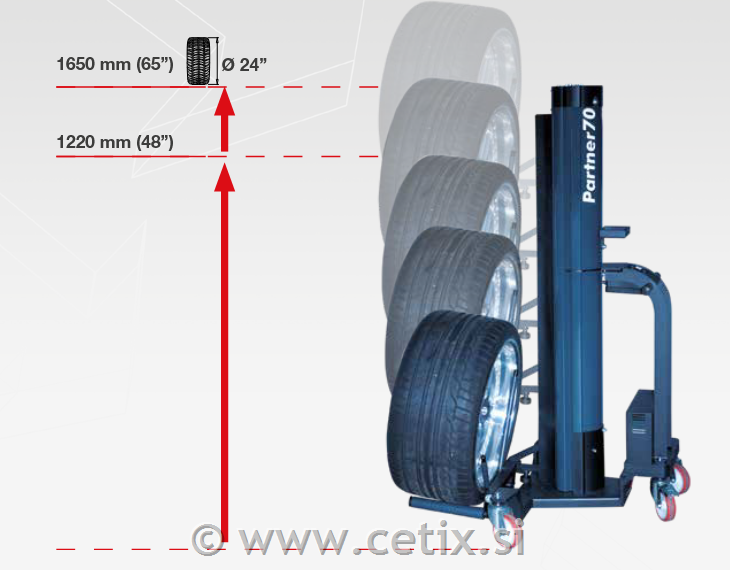 Partner 70 vam pomaga enostavno in varno sneti, premakniti in namestiti kolesa avtomobilov, SUV-jev in lahkih dostavnih vozil s težo do 70 kg.
