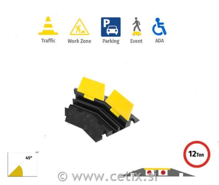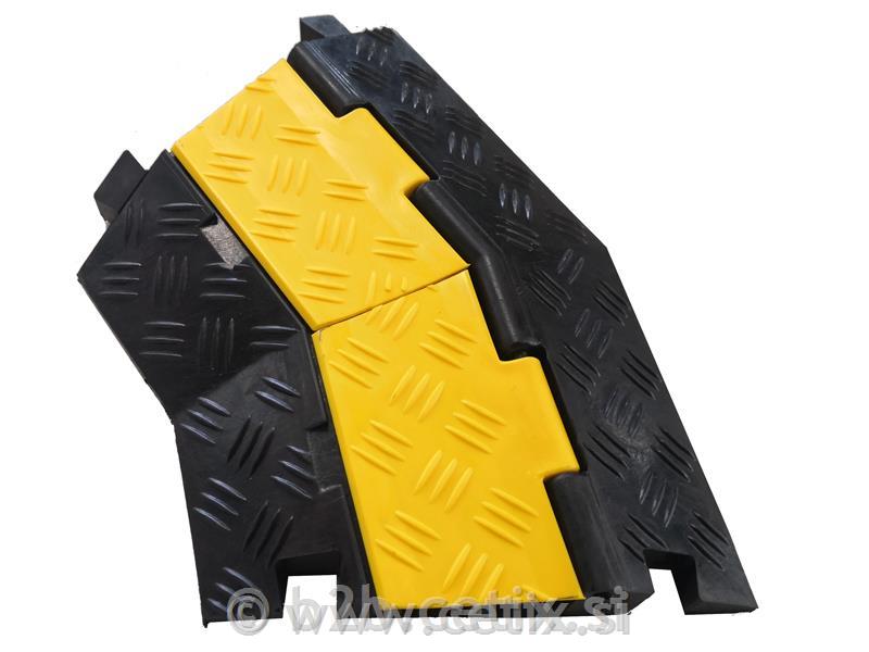 Prehodni kanali za kable so zasnovani za omogočanje prehoda in zaščito kablov, cevi in kanalčkov v različnih situacijah, kot so gradbišča ali med prireditvami in javnimi dogodki. Ti kanali so izdelani iz vulkanizirane, visoko odporne gume, kar zagotavlja robustno zaščito za kable spodaj. Opremljeni so z zgibnim pokrovom iz rumeno obarvanega PVC-ja, ki povečuje vidljivost kanalov in olajša njihovo prepoznavanje. Prehodni kanali za kable so sestavljeni iz modulov, ki se enostavno zaskočijo skupaj, kar omogoča preprosto prenašanje in nameščanje. Moduli se med seboj varno povežejo, tako da tvorijo neprekinjeno površino za prehod pešcev in lahkih vozil.