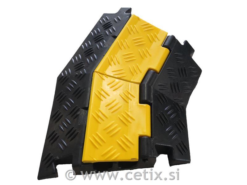 Prehodni kanali za kable so zasnovani za omogočanje prehoda in zaščito kablov, cevi in kanalčkov v različnih situacijah, kot so gradbišča ali med prireditvami in javnimi dogodki. Ti kanali so izdelani iz vulkanizirane, visoko odporne gume, kar zagotavlja robustno zaščito za kable spodaj. Opremljeni so z zgibnim pokrovom iz rumeno obarvanega PVC-ja, ki povečuje vidljivost kanalov in olajša njihovo prepoznavanje. Prehodni kanali za kable so sestavljeni iz modulov, ki se enostavno zaskočijo skupaj, kar omogoča preprosto prenašanje in nameščanje. Moduli se med seboj varno povežejo, tako da tvorijo neprekinjeno površino za prehod pešcev in lahkih vozil.