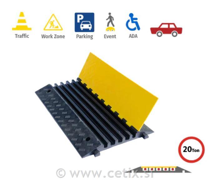 Platforma za urejanje kablov DH-CP-L5M je izdelana iz vulkanizirane gume z rumenim PVC pokrovom, ki ga je mogoče odpreti, opremljena s 5 kanali velikosti 3,8 x 3,5 cm. Dimenzije 90 x 50 x 5,5 cm in nosilnost do 20 ton jo naredijo idealno za gradbišča, dogodke in gost promet. Modularni element, ki ga je enostavno sestaviti.