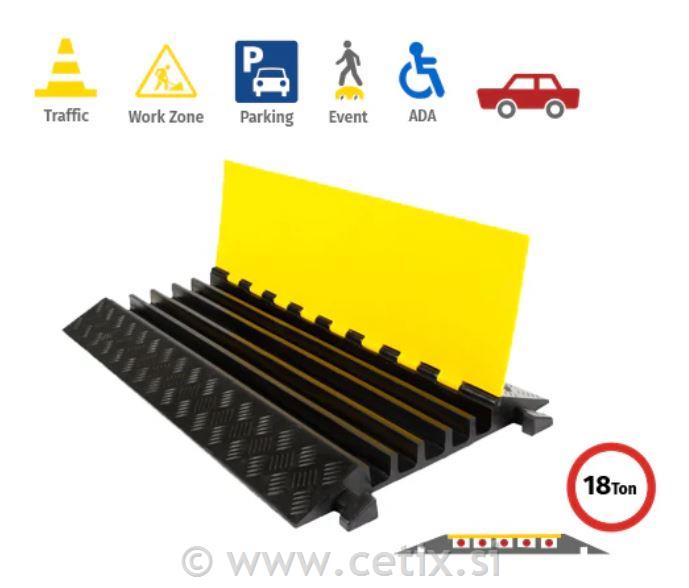 Platforma za urejanje kablov DH-CP-L5M je izdelana iz vulkanizirane gume z rumenim PVC pokrovom, ki ga je mogoče odpreti, opremljena s 5 kanali velikosti 3,8 x 3,5 cm. Dimenzije 90 x 50 x 5,5 cm in nosilnost do 18 ton jo naredijo idealno za gradbišča, dogodke in gost promet. Modularni element, ki ga je enostavno sestaviti.