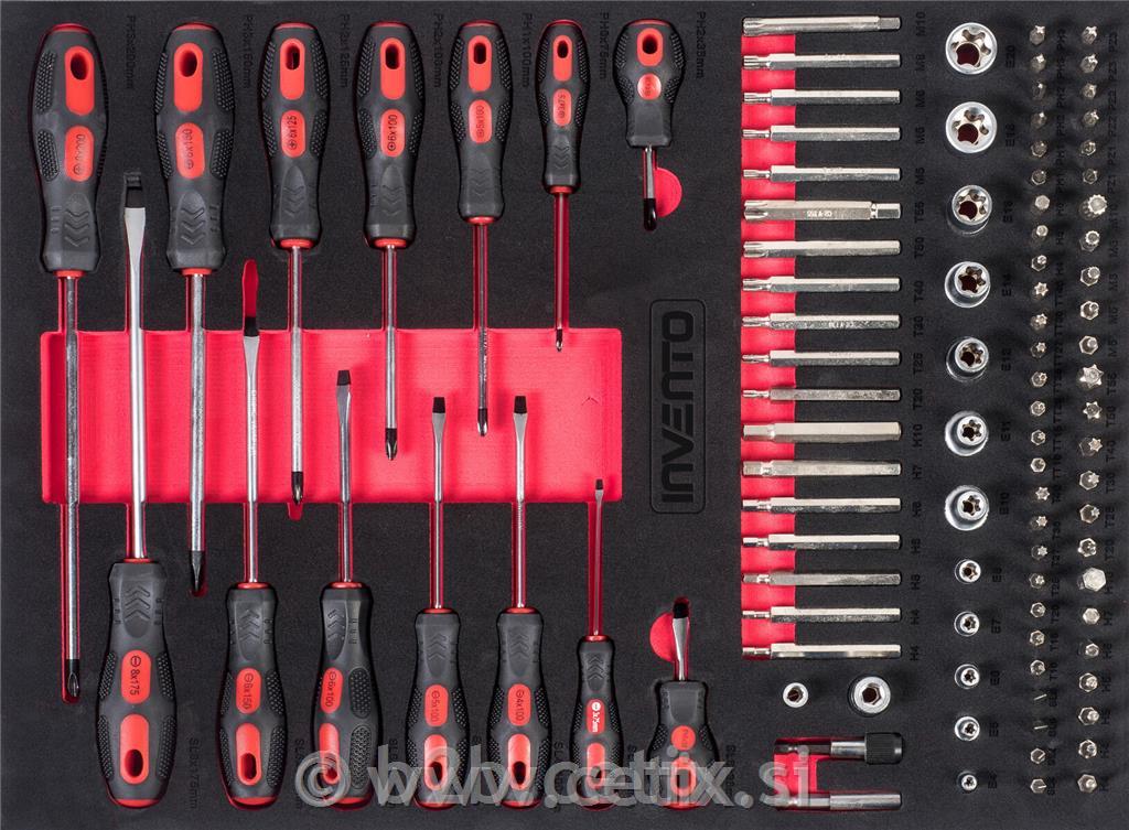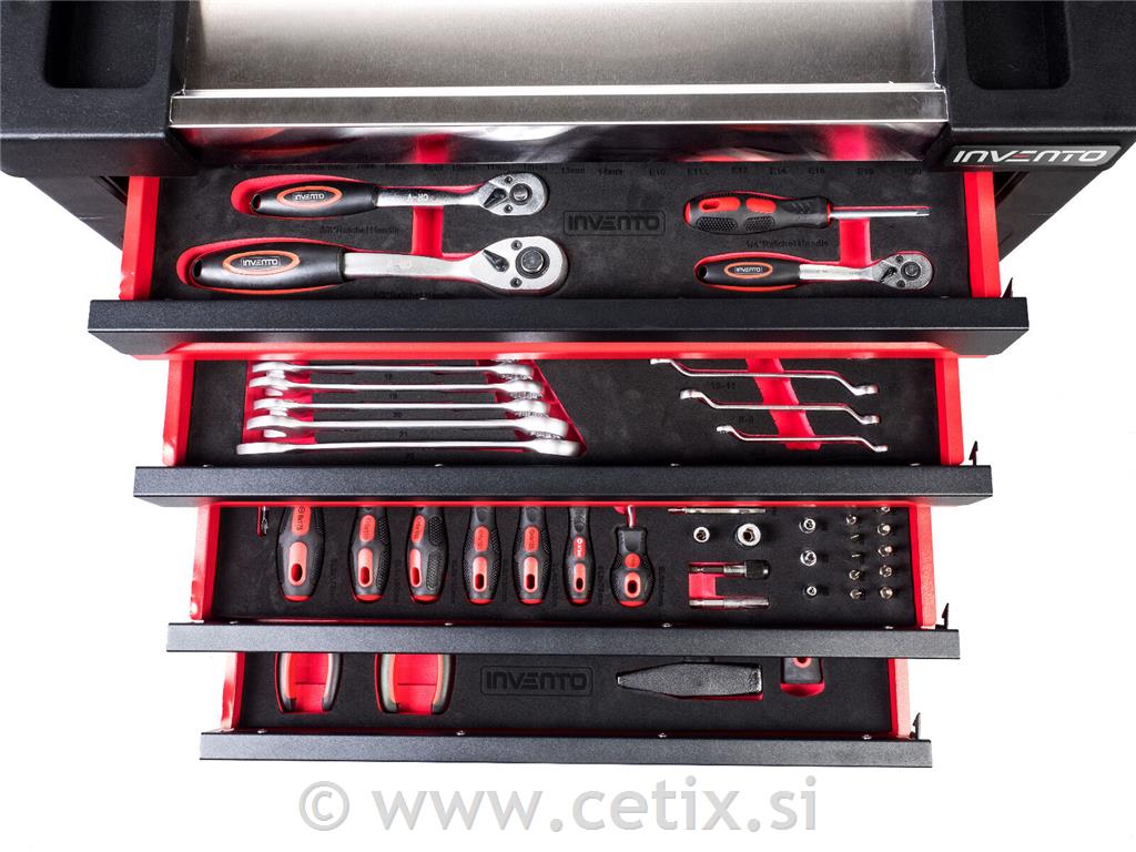 INVENTO delovni voziček ima 6 predalov, od katerih so štirje napolnjeni z 220 kosi orodja. Vsebuje vse kar potrebujete za opravljanje svojega dela!