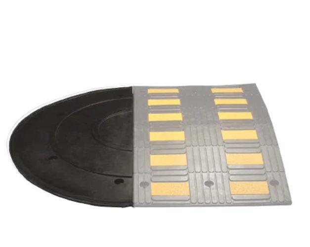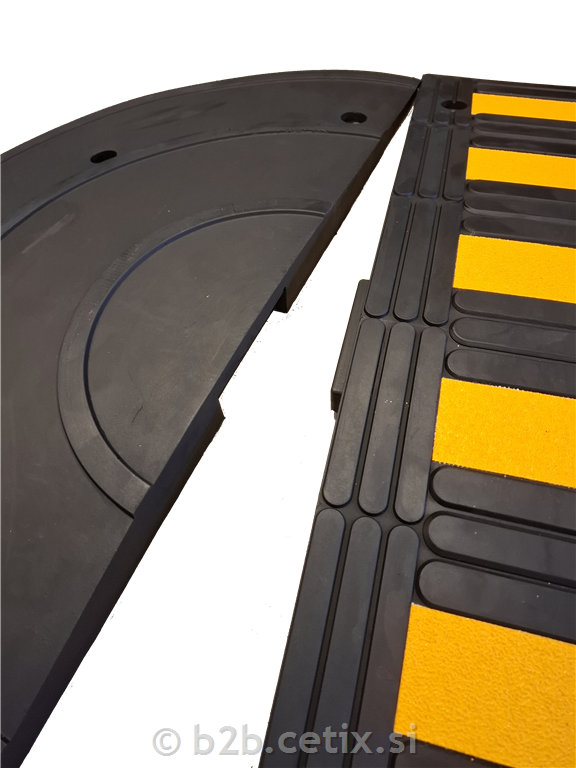 Črni gumijasti ležeči policaji z rumenimi odsevnimi trakovi. Opremljeni so z rumenimi odsevnimi in protizdrsnimi vložki za maksimalno vidljivost.