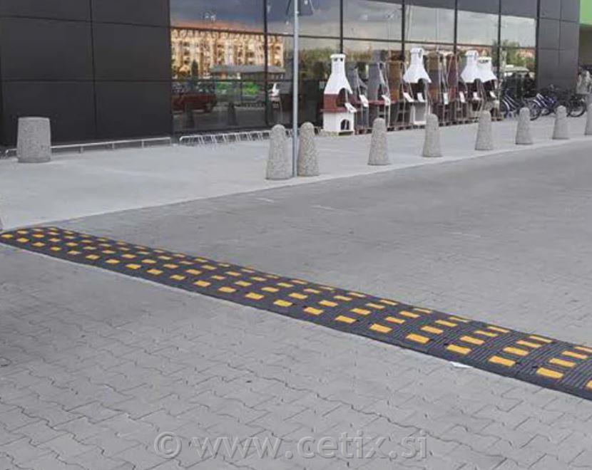 Črni gumijasti ležeči policaji z rumenimi odsevnimi trakovi. Opremljeni so z rumenimi odsevnimi in protizdrsnimi vložki za maksimalno vidljivost.